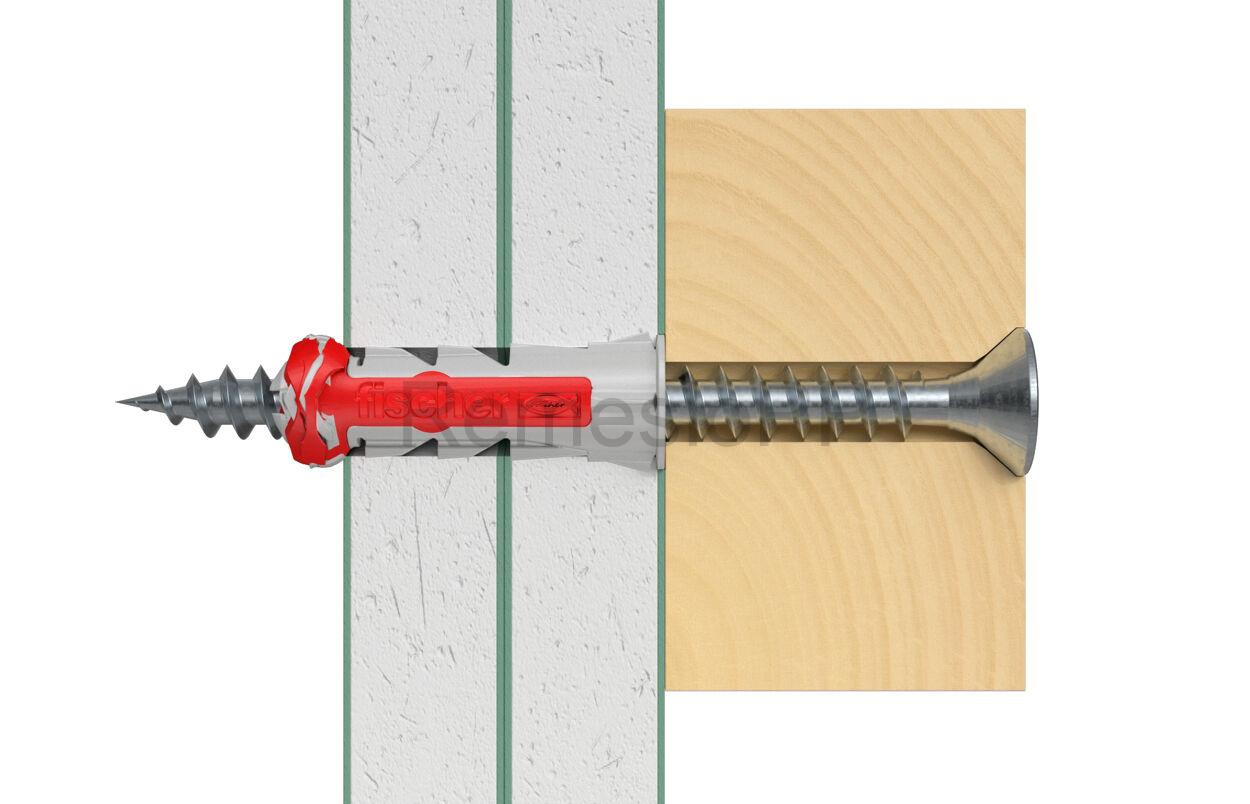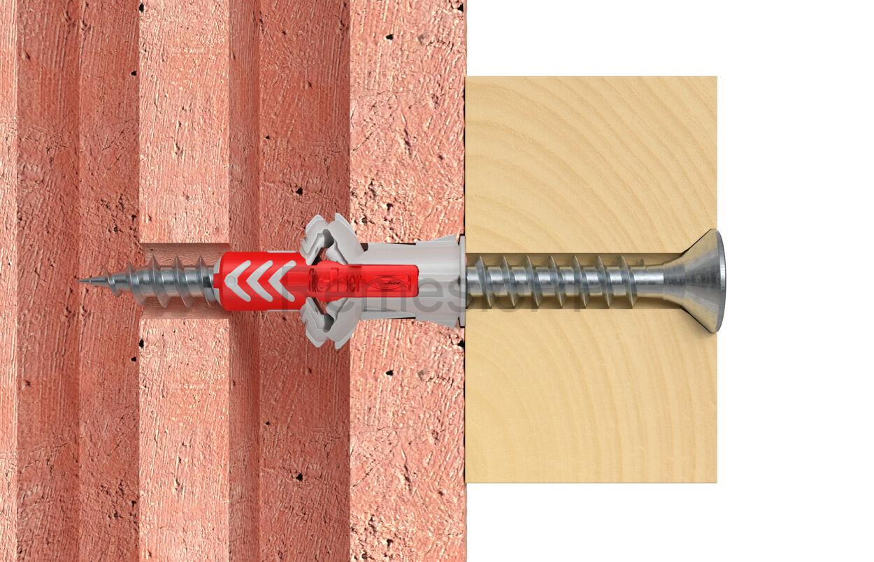 Pri použití hmoždinky DuoPower môžete počítať s naozaj výnimočnou únosnosťou. Kombinácia dvoch materiálov rôznych vlastností je cestou nie len ku maximálnemu zaťaženiu, ale aj ku samostatnej voľbe princípu fungovanie hmoždinky podľa toho, v akom stavebnom materiály je práve montovaná - či sa sklopí, rozoprie alebo zauzluje. Rozperné krídelká červenej časti napomáhajú správnej funkcií šedej, tuhšej časti hmoždinky. Skrutka sa ľahko skrutkuje, ale pri doťahovaní cítite, ako hmoždinka dobre ťahá a golier zabraňuje hmoždinke v zapadnutí do vyvŕtaného otvoru.
